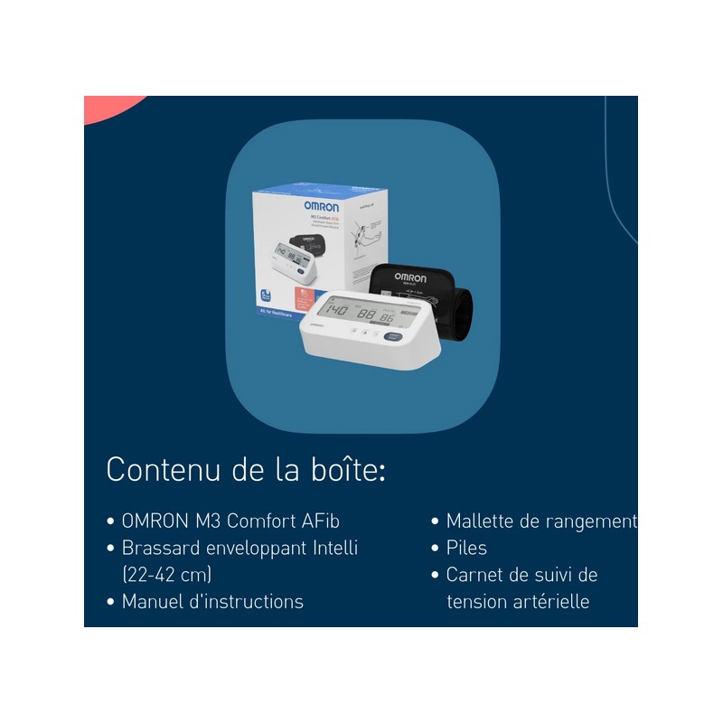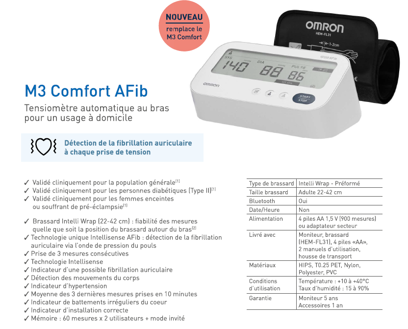 L'OMRON M3 COMFORT AFIB est un tensiomètre électronique avancé pour simplifier la surveillance de la tension artérielle à domicile, tout en offrant des fonctionnalités supplémentaires qui soutiennent la prévention cardiovasculaire.